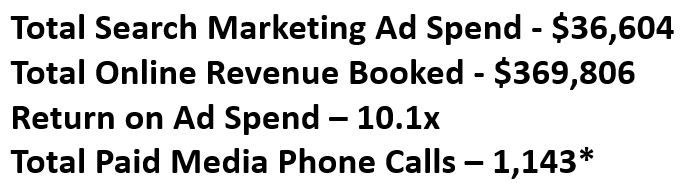 Using the best practices we’ve put into place after years of marketing resorts online, we delivered an impressive return for Q1-Q3 in 2019. The good news for our client is that these results have improved even more in 2020, despite a global pandemic. Note that, in the results below, we were unable to track revenue from phone calls, so we estimate there’s another $250k in revenue driven by these campaigns.